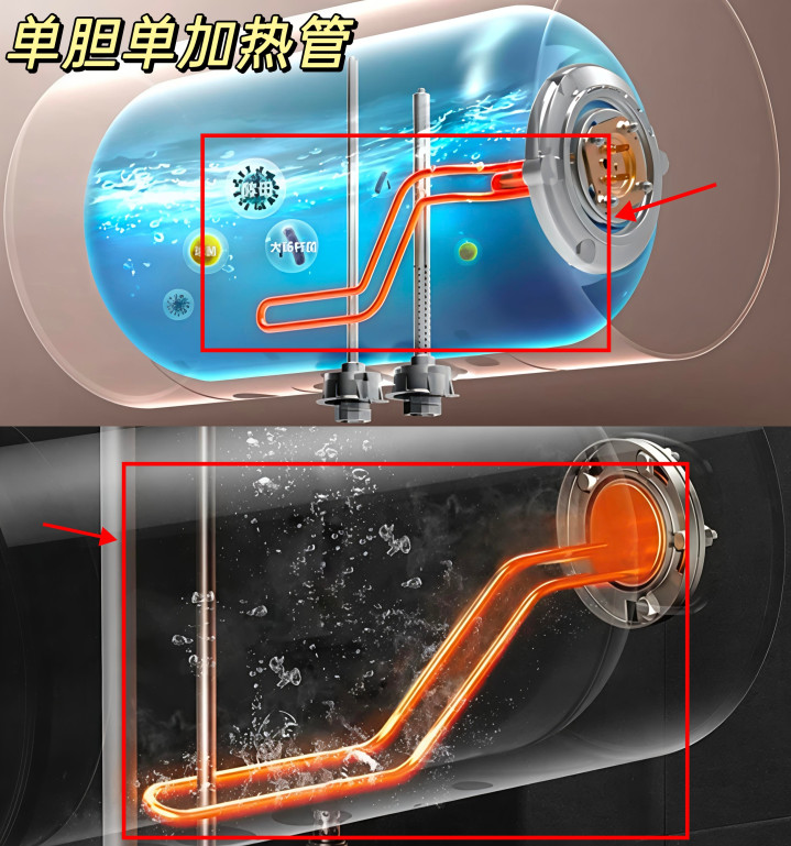 千万别装∶一根加热管加热的,单加热管加热速度慢,等待热水时间长;热水储量固定,功率单一,保温和升温效果都不如多胆多管。