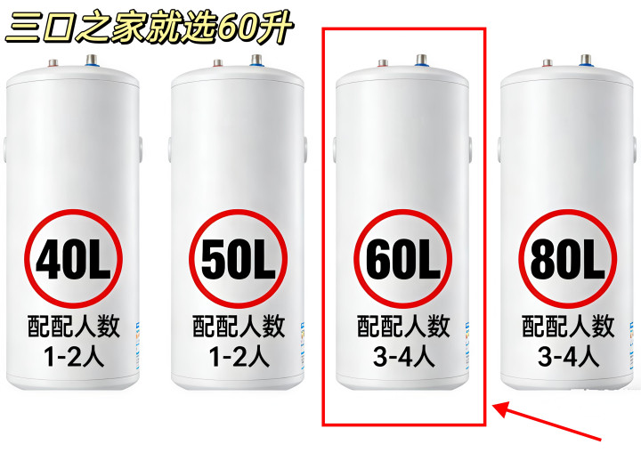 容量就选∶60升,很适配三口之家,水量充足,单人洗漱、全家连续洗浴完全够用;体积不算大,不占太多卫生间空间,如果是独居40升也够用。