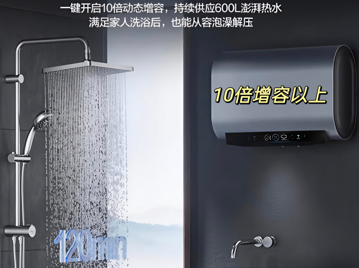 其次要选∶10倍以上增容的电热水器,边洗边加热,60升热水器能出600升水,就是10倍增容,能大幅提升热水输出量,持续供水久,多人连续洗澡不用等,使用体验很好。