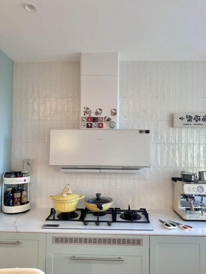 没有吊柜挡光,厨房亮堂了一倍。以前油烟机藏在吊柜下面,一年都不擦一次,现在敞着,每天都擦,厨房永远干干净净。