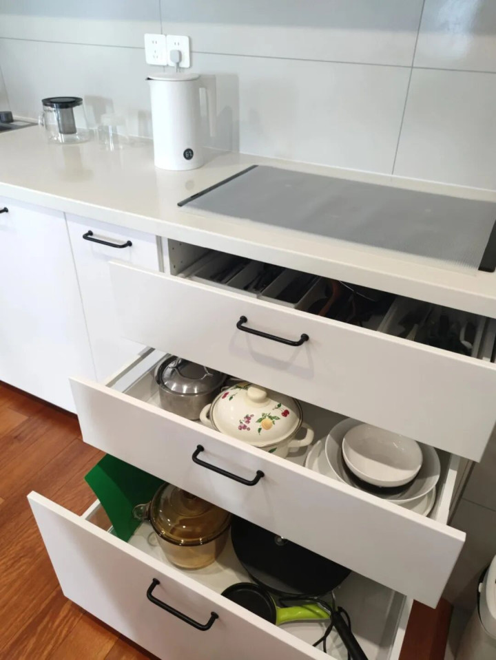 我邻居家的地柜,做了三层抽屉,各种锅都能塞进去,台面干干净净,一点不杂乱。