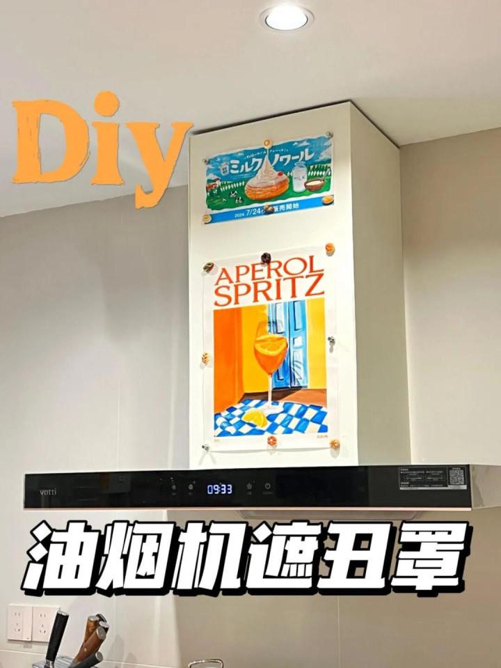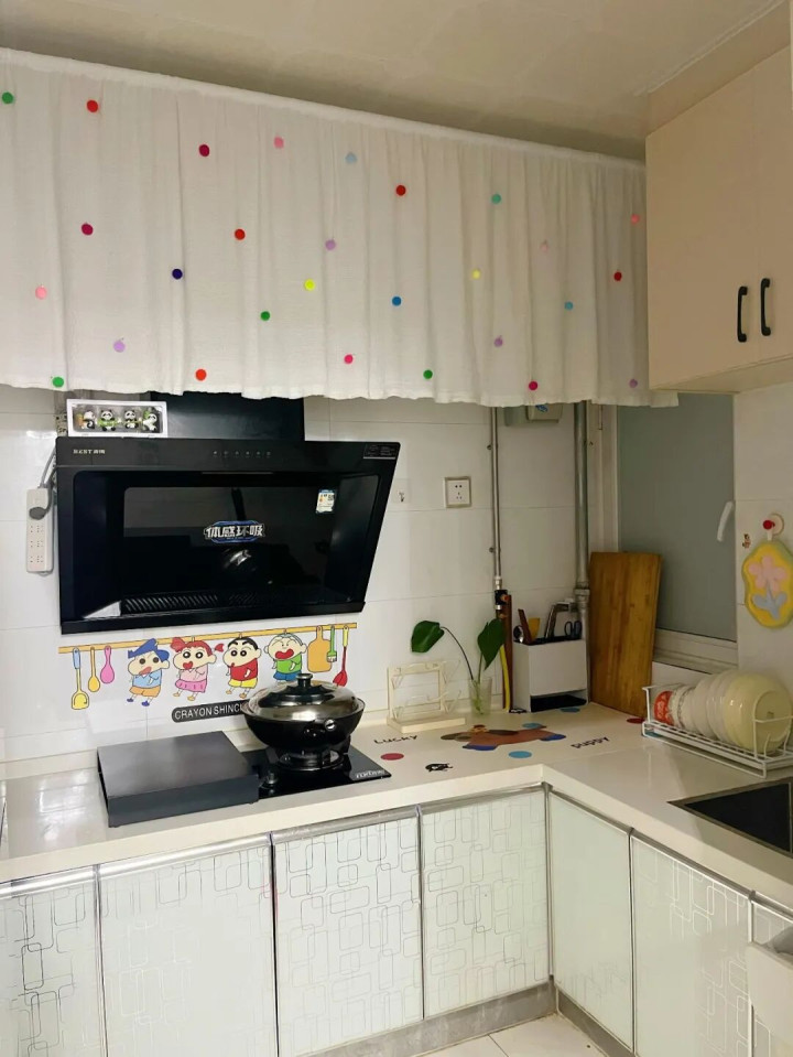 想最低成本改造的,选一块防水防油的帘子,往油烟机管道上边一挂,瞬间遮丑。而且帘子拆洗方便,脏了直接拿下来洗,还能随时换款式。