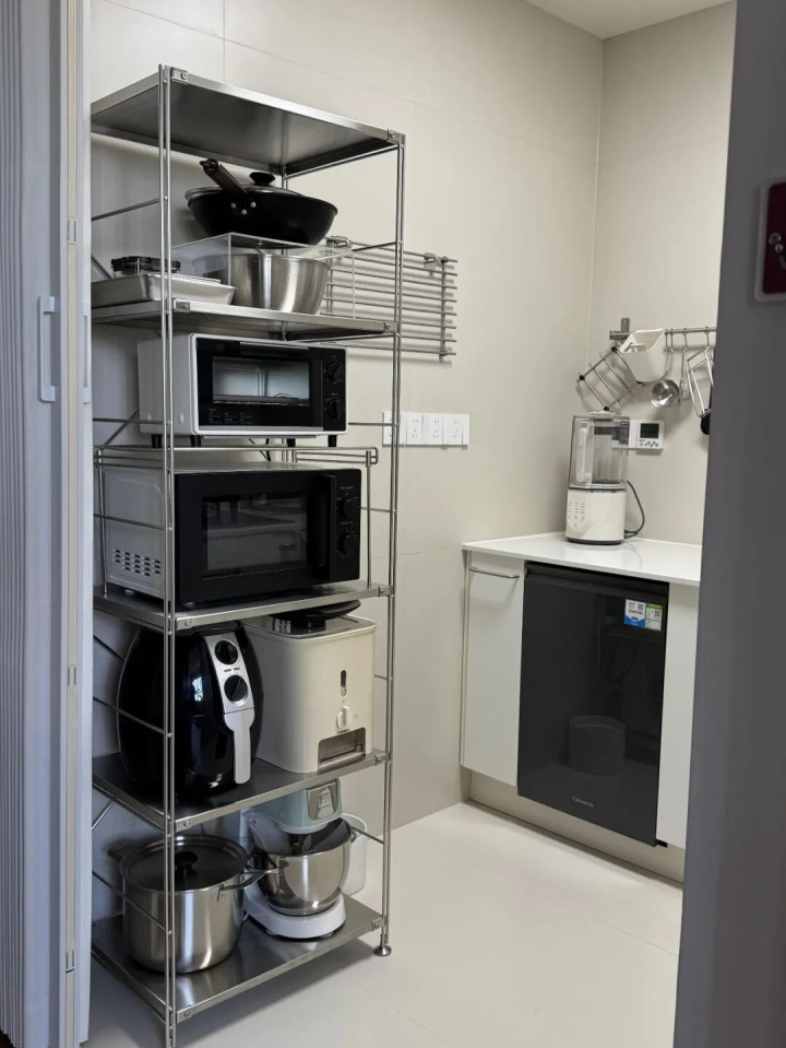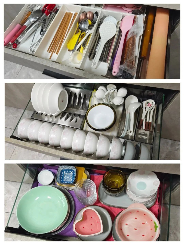第一层放筷子、勺子、削皮刀这些小工具,随手一拉就能拿到。第二层放碗碟盘子,分类摆放一目了然。第三层放大锅、汤锅,做饭时转身就能取。