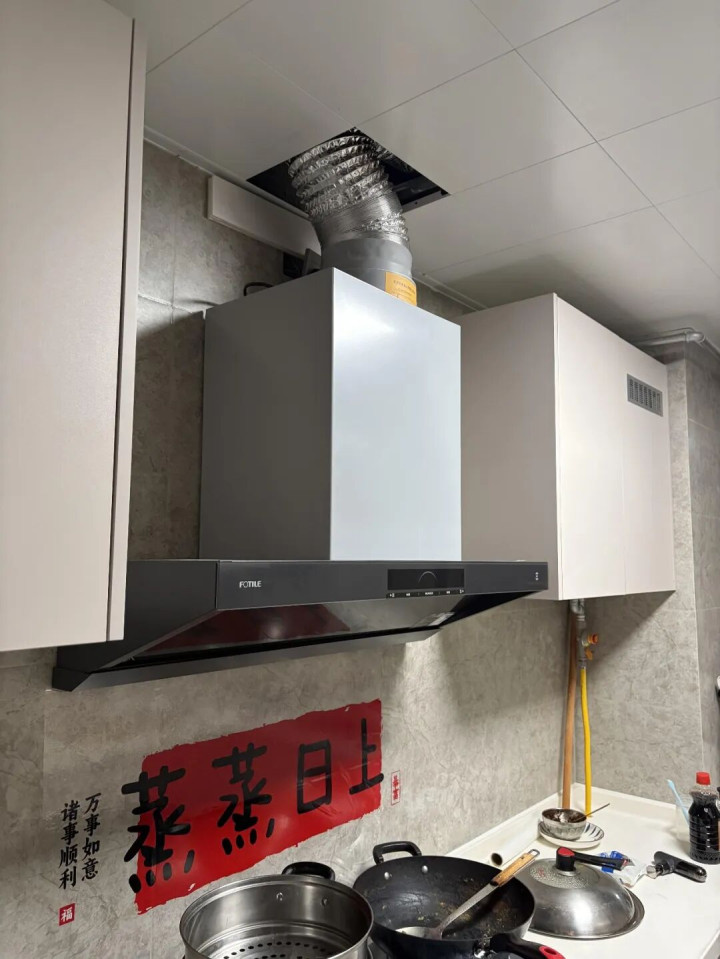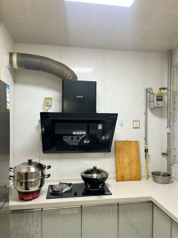 解决了收纳,还有个关键问题:不装吊柜,油烟机的管道露在外面,丑得没法看咋办?