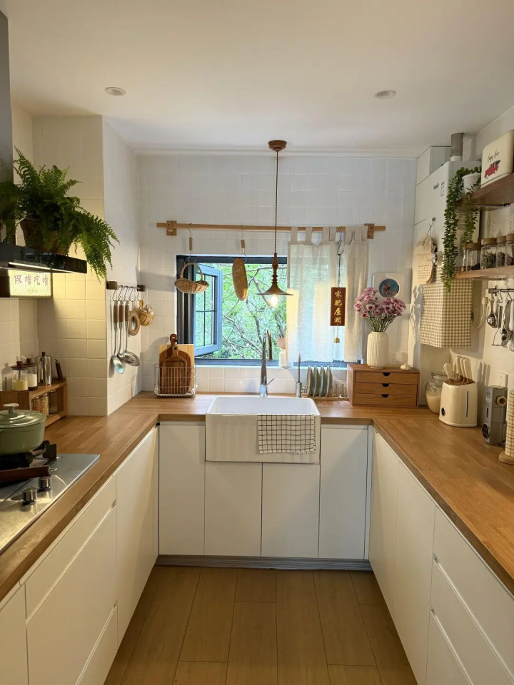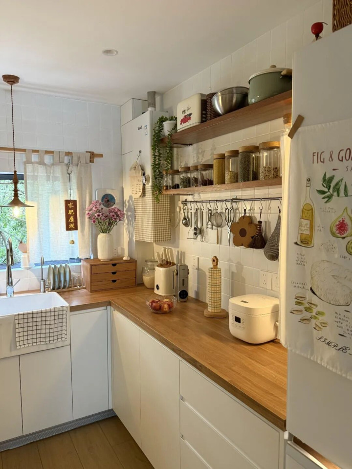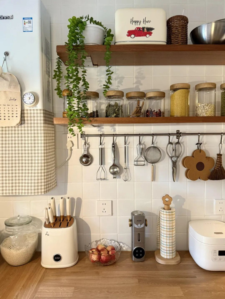 在墙面钉几块实木隔板,靠近灶台的位置,放油盐酱醋、常用碗碟,抬手就能拿到,做饭效率高。远离油烟的区域,摆上几盆小绿植、精致的咖啡杯,再就是干货杂粮,瞬间氛围感拉满。